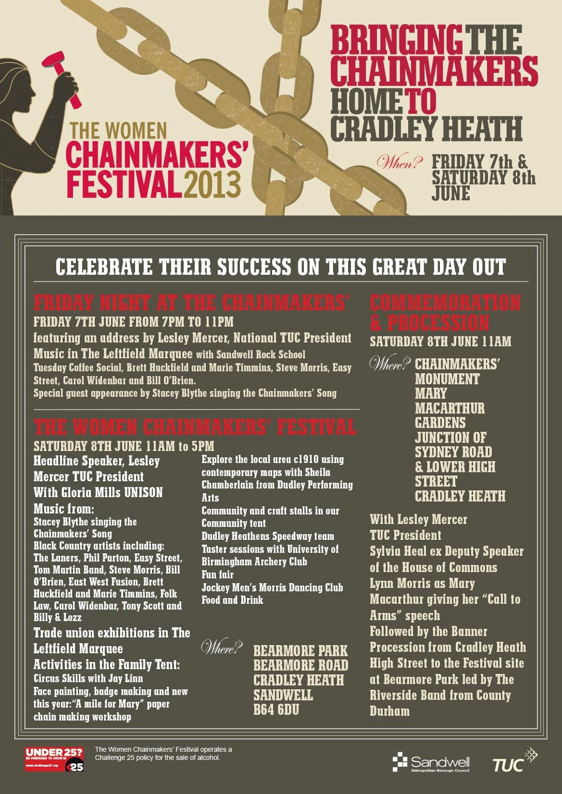 The tenth Women Chainmakers festival takes place at Bearmore Mound on Saturday 7th June from 11.00 a.m. to 5.00 p.m. and will feature TUC General Secretary Kay Carberry and local black country performers.